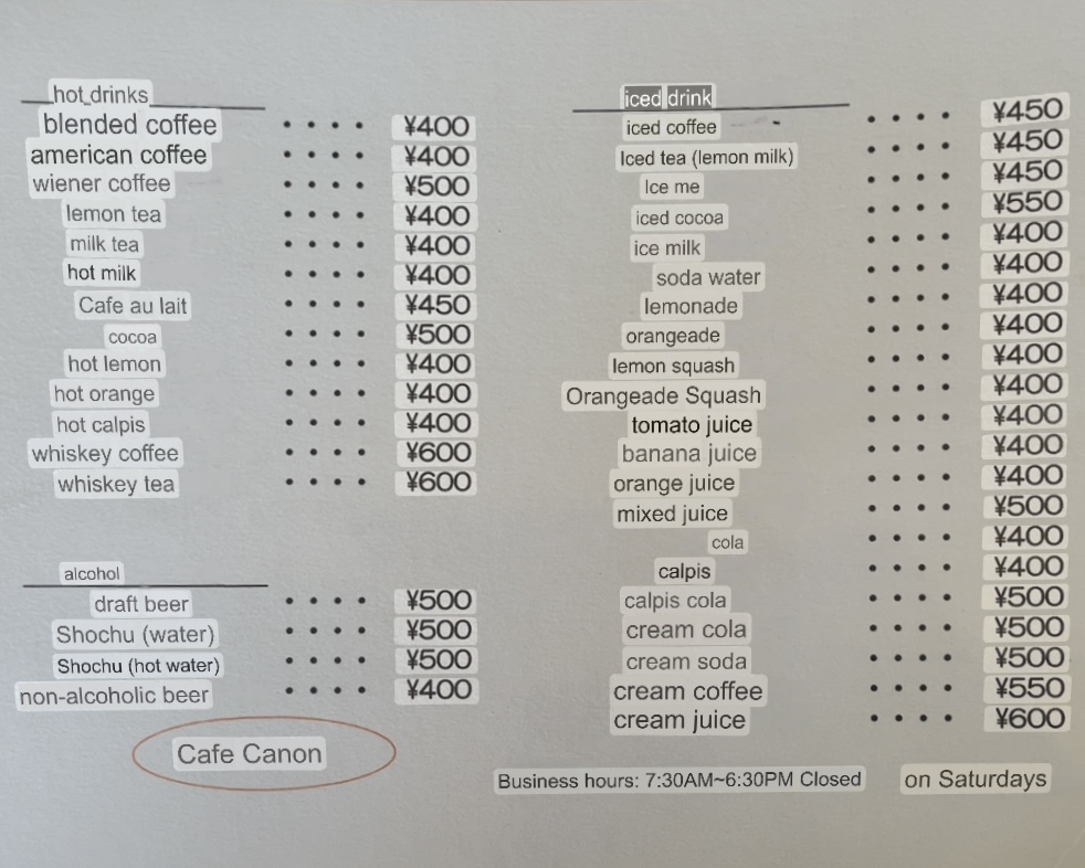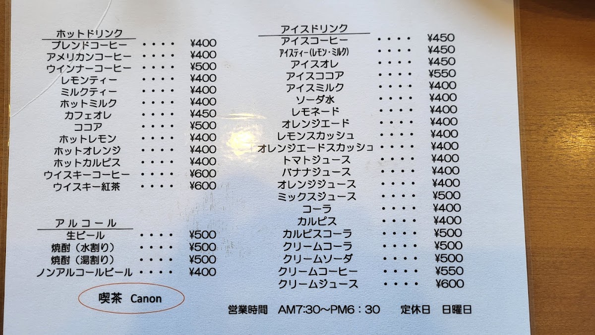 At 喫茶 Canon, breakfast is a highlight, served from 7:30 AM to 10:30 AM. Guests rave about the fluffy egg sandwiches paired with deliciously brewed coffee. For lunch, savor a variety of options like curry, yakimeshi, and yakiudon, all affordably priced between ¥600-¥650. Sandwiches, too, are an inviting choice, while refreshing soft drinks anchor the beverage selection.